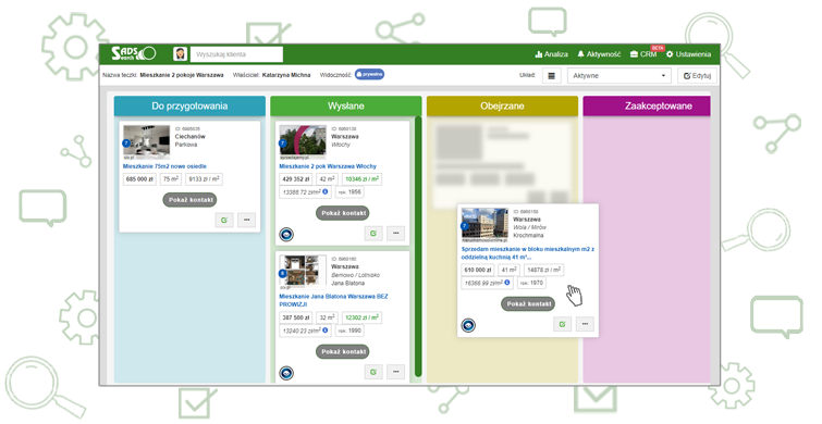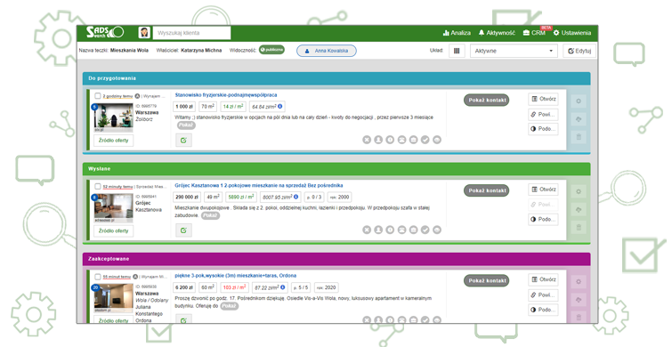 W Sads.pl możesz samodzielnie zdefiniować tzw. karty pracy i przypisać je do każdej teczki. Korzystając z kart pracy możesz szybko i łatwo grupować oferty w teczkach. Dzięki grupowaniu ogłoszeń możesz utworzyć tzw. lejki sprzedaży i pozyskiwania, a pogrupowane oferty wyświetlisz w formie listy lub tablicy Kanban. Pozwala to na lepszą organizację pracy z ogłoszeniami i zwiększenie skuteczności w pozyskiwaniu oraz sprzedaży nieruchomości.
