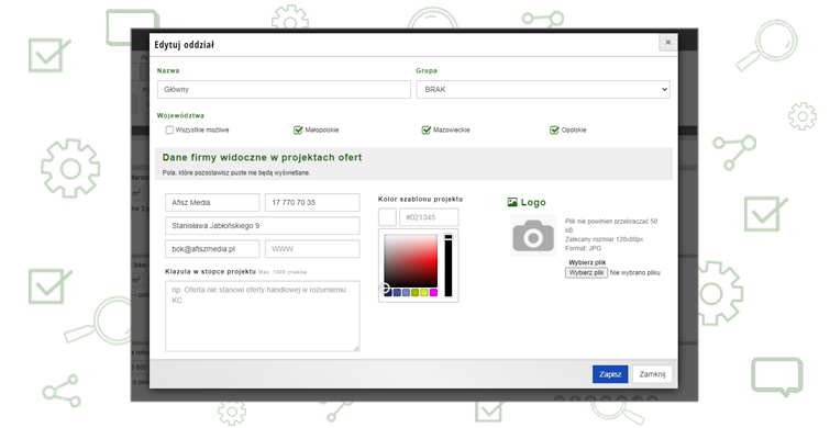 Jeżeli korzystasz z projektów ofert to każdy odział może mieć inne dane firmy, w tym dane kontaktowe, adresowe, a nawet logo. Dzięki takiej personalizacji masz możliwość dokładnie dopasować dane na projektach do swoich oczekiwań.