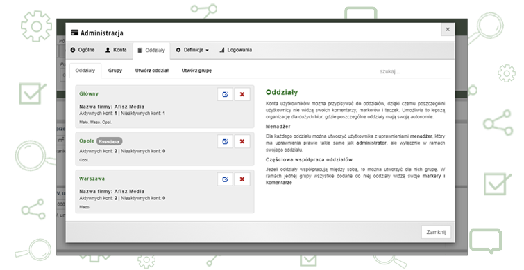 Każdy oddział ma swoją bazę klientów, folderów, komentarzy i markerów. Tylko administratorzy mogą przeglądać jednocześnie dane w różnych oddziałach.